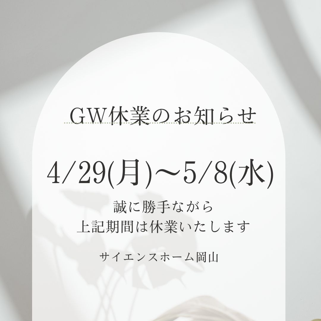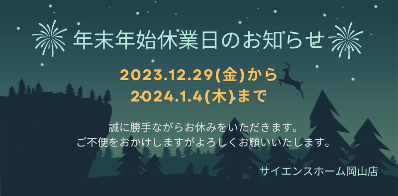 サイエンスホーム岡山早島展示場、岡山展示場、笠岡展示場は誠に勝手ながら、12月29日(金)~2024年1月4日(木)の期間を休業とさせていただきます。皆様には、ご不便をおかけしますが、何卒よろしくお願いします。...