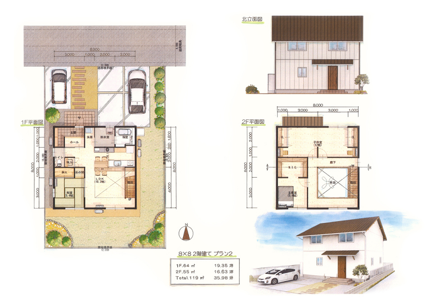 | 8×8 | 1F 64㎡(19.35坪) ・2F 55㎡(16.63坪) ・合計 119㎡(35.98坪) |