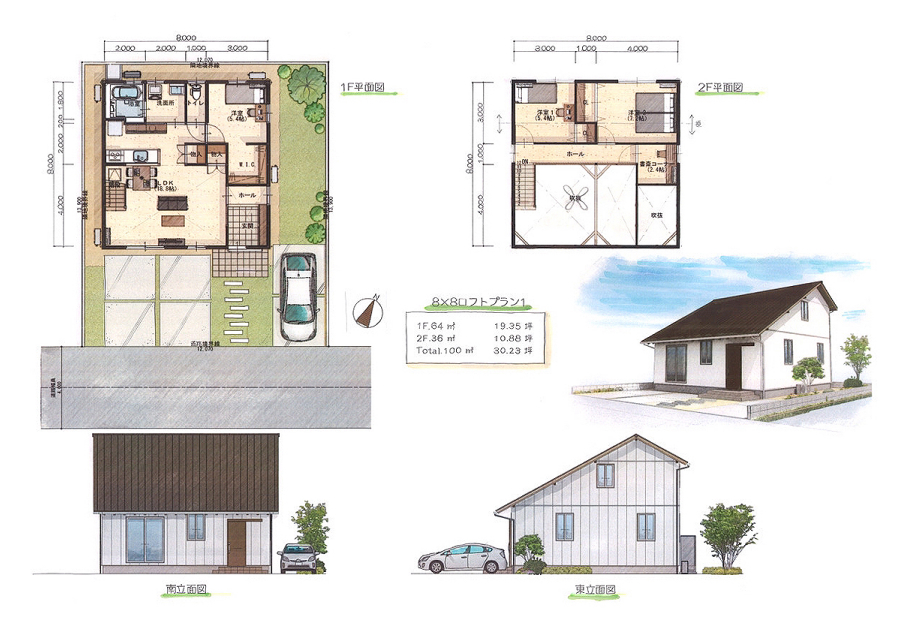 | 8×8 | 1F 64㎡(19.35坪) ・2F 36㎡(10.88坪) ・合計 100㎡(30.23坪) |