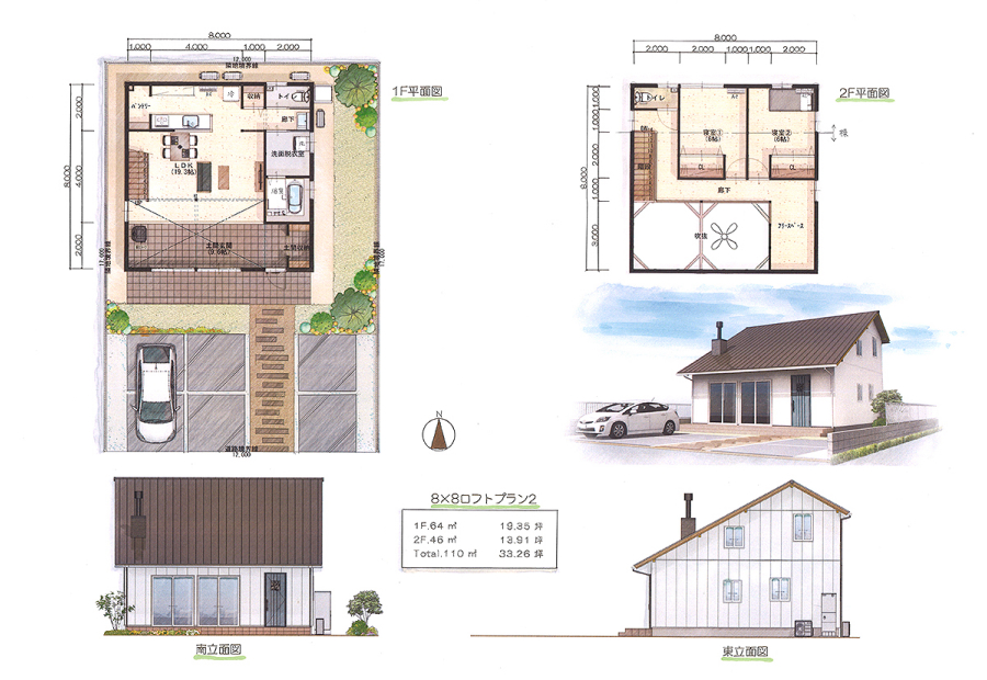 | 8×8 | 1F 64㎡(19.35坪) ・2F 46㎡(13.91坪) ・合計 110㎡(33.26坪) |