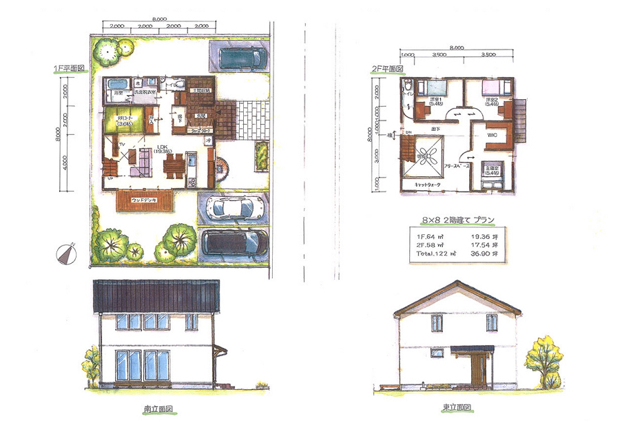 | 8×8 | 1F 64㎡(16.36坪) ・2F 58㎡(17.54坪) ・合計 122㎡(36.90坪) |