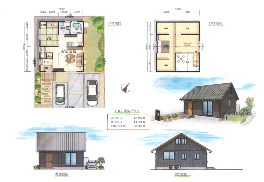 | 8×7 | 1F 56㎡(16.93坪) ・2F 38㎡(11.49坪) ・合計 94㎡(28.42坪) |