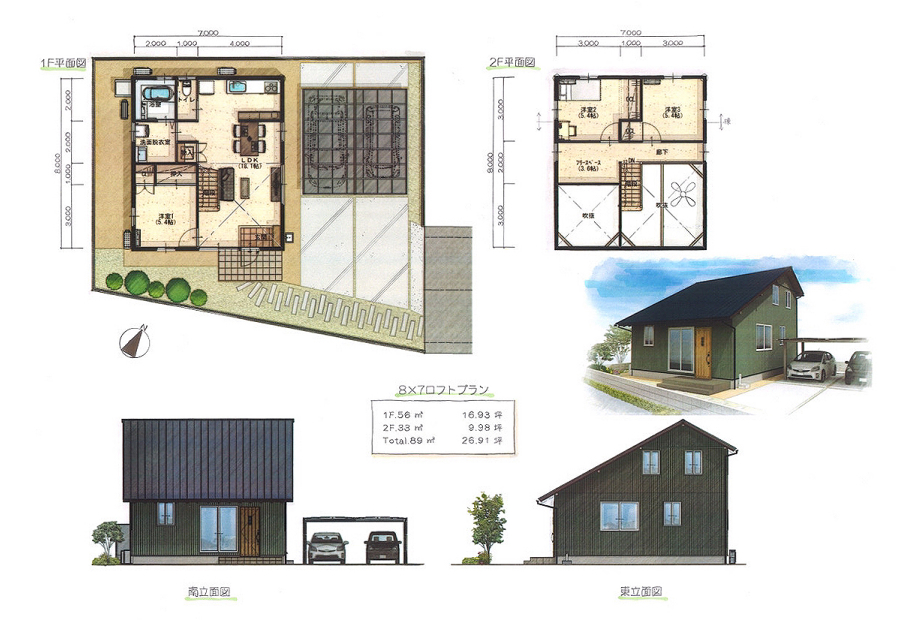 | 8×7 | 1F 56㎡(16.93坪) ・2F 33㎡(9.98坪) ・合計 89㎡(26.91坪) |