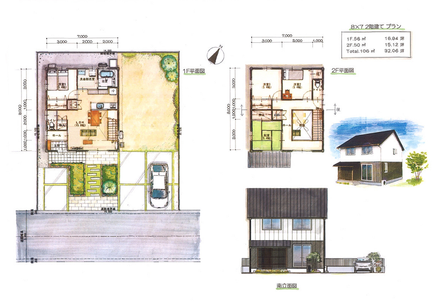 | 8×7 | 1F 56㎡(16.94坪) ・2F 50㎡(15.12坪) ・合計 106㎡(32.06坪) |