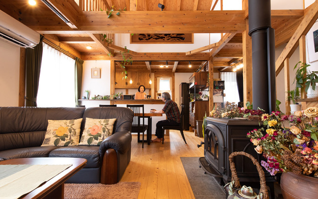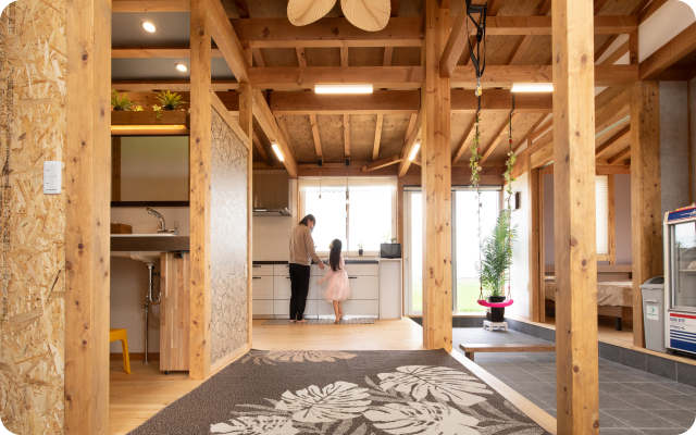 モデルハウスにふらりと寄った時に一目惚れした真壁づくりと、広い土間のある家にしたいと夫婦の希望が一致。大黒柱の4面が見える間取りや、子どもの勉強スペースもキッチンから見守れる位置にしたいと希望しました。住んでみると、冬の暖かさにびっくり!本当に快適な冬を過ごすことができました。窓からの景色、木の匂いも最高で、真壁づくりの家を建ててよかったと感じています。細かなこだわりを現実にしてくれ、大満足です。