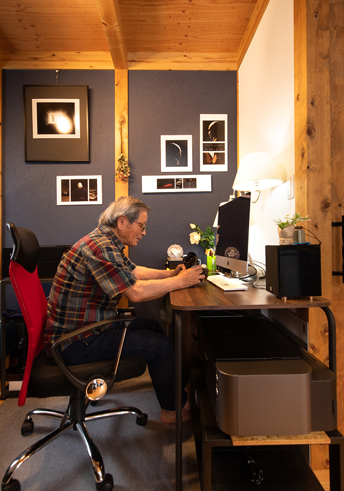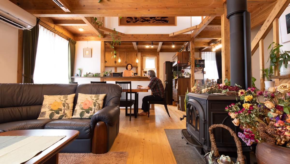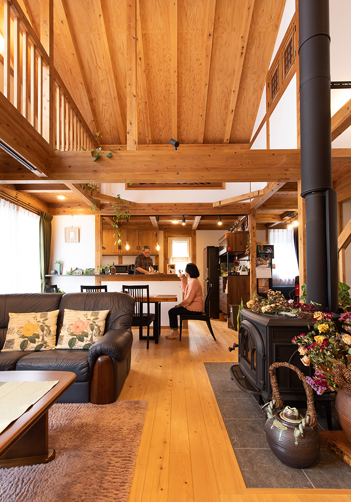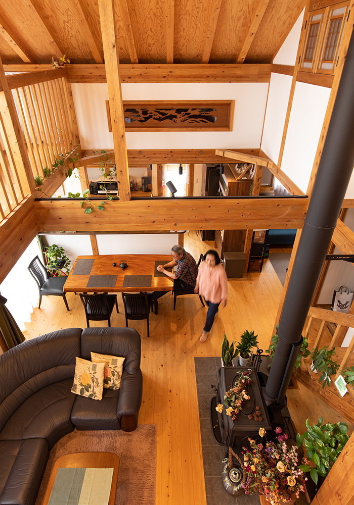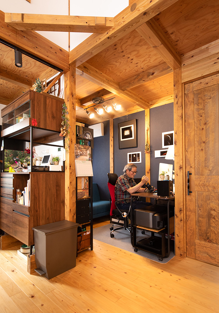 モスグリーンのサイディング、大屋根の平屋は重厚感たっぷりです。70代のMさん夫妻の、趣味が楽しめ、暮らしやすい動線を追求した家が完成しました。玄関に足を踏み入れると、組子細工をあしらった欄間がお出迎え。壁の向こうに配置した和室の光取りにもなっています。手すりをつけた玄関やホール、トイレの間口など、1階の動線は車椅子でも行き来できるようにスペースを確保。玄関近くにトイレがあるので、お出かけ前後に便利な間取りです。1階北側へ配置した二間続きの和室を夫婦の寝室に。家の中心に薪ストーブを置いたリビングは、現しになったひのきの大黒柱や梁など、真壁づくりそのものがインテリアの主役になっています。吹き抜けのリビングを見上げると、ロフト部分にいくつもの小窓があり、遊び心にあふれています。Mさんのお気に入りは、リビングに隣接した秘密基地のような書斎スペース。趣味のカメラで撮影したMさんの作品を展示するギャラリー兼アトリエです。