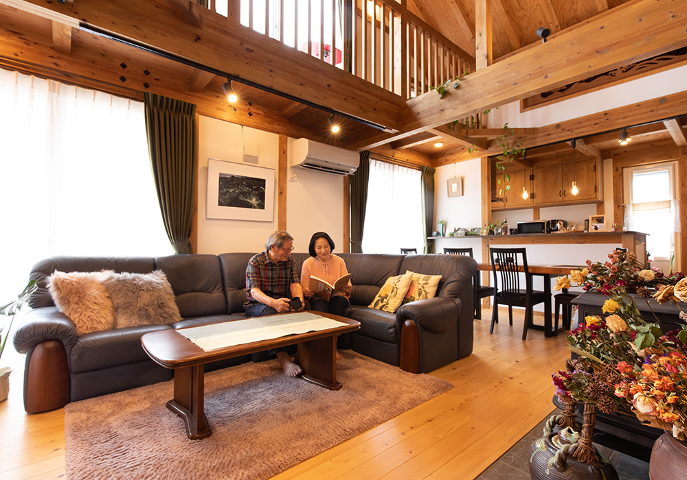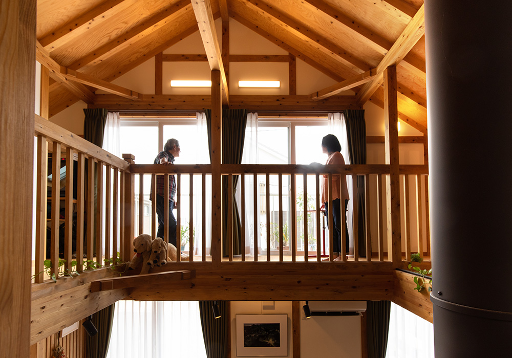 収納や小部屋があるロフトの窓から注ぐ太陽光が、吹き抜けから1階へも降り注ぐリビング。「開放感が心地よく、細やかな演出も楽しめる家に大満足。毎日をエンジョイしています」。